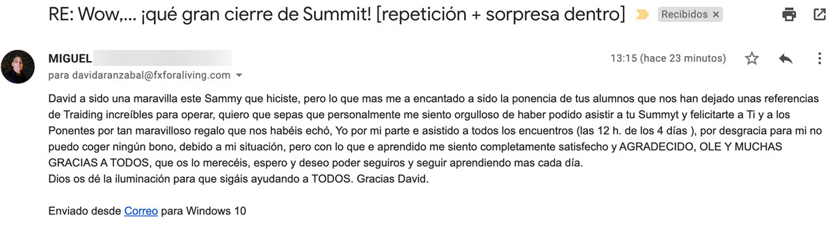 "Personalmente me siento orgulloso de haber asistido a este summit, felicitarte por tan maravilloso regalo que nos habeis hecho"